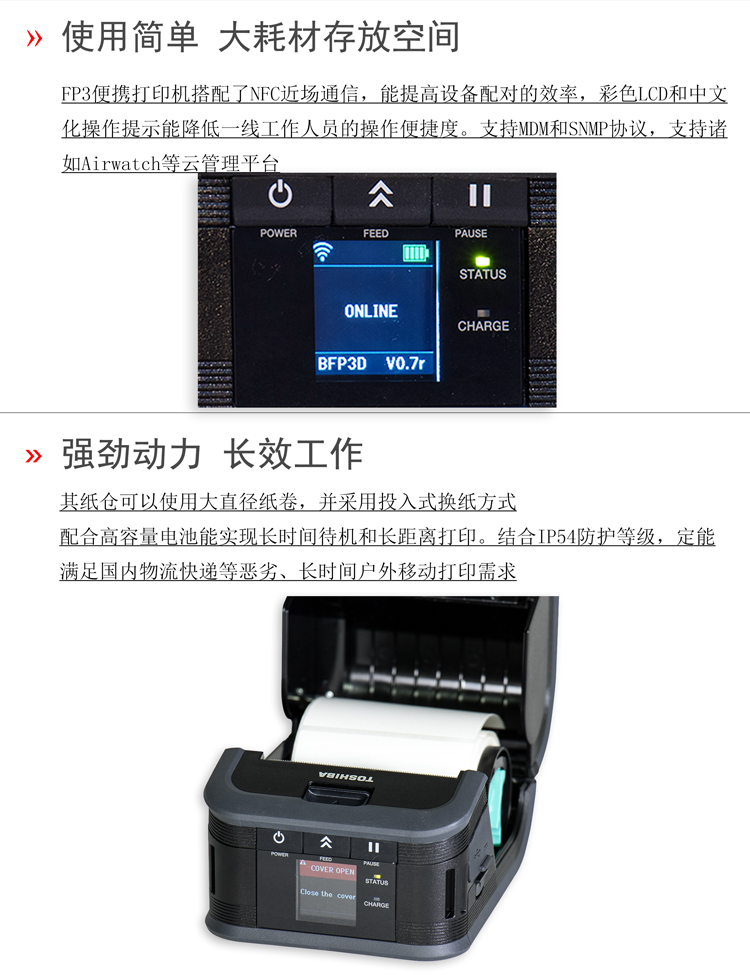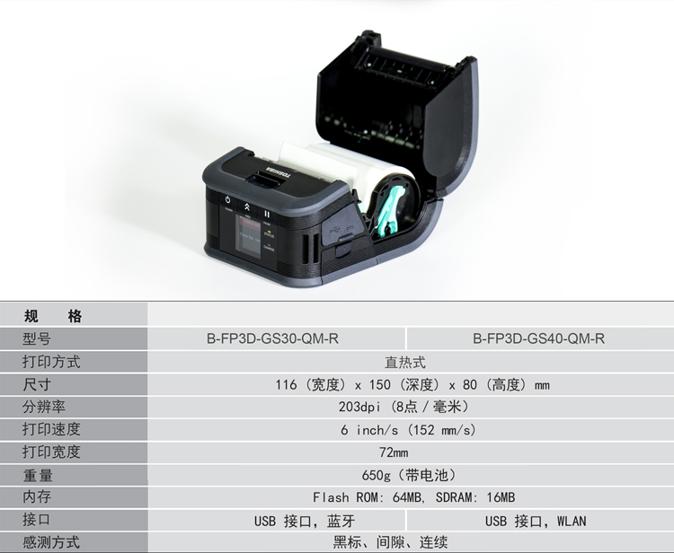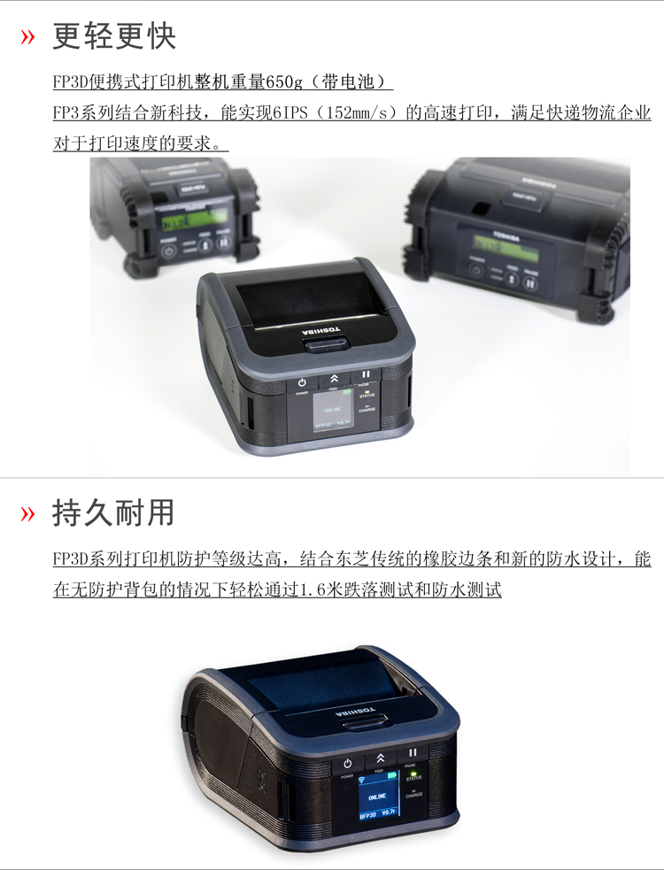 東芝將高性能移動(dòng)打印技術(shù)帶到你的手中,F(xiàn)P3D標(biāo)準(zhǔn)版3寸便攜式熱敏打印機(jī),擁有6IPS(152mm/s)高速打印、彩色中文液晶屏等技術(shù),蘊(yùn)含著東芝對(duì)于便攜性、可靠性和高性能的承諾,滿足各類便攜打印的應(yīng)用需求。