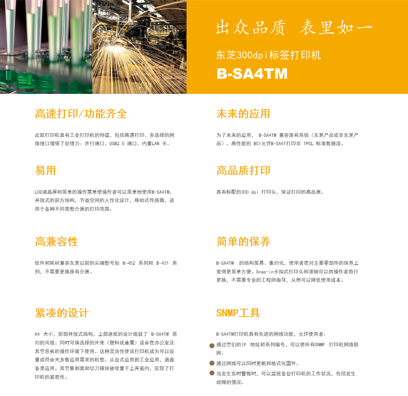 機(jī)器外形小巧、簡(jiǎn)單易用,卻具有工業(yè)打印機(jī)功能完整、牢固耐用的特點(diǎn)。先進(jìn)的網(wǎng)絡(luò)功能,可支持現(xiàn)今主流的通訊端口,使用戶可以通過(guò)網(wǎng)絡(luò)對(duì)打印機(jī)進(jìn)行遠(yuǎn)程管理。人性化設(shè)計(jì)適用于安靜的辦公環(huán)境,高質(zhì)量的打印輸出和出色的功能保證,又同樣適用于重工業(yè)環(huán)境。在打印應(yīng)用方面,真正地提供了“解決方案”,成為全球公認(rèn)的品牌。